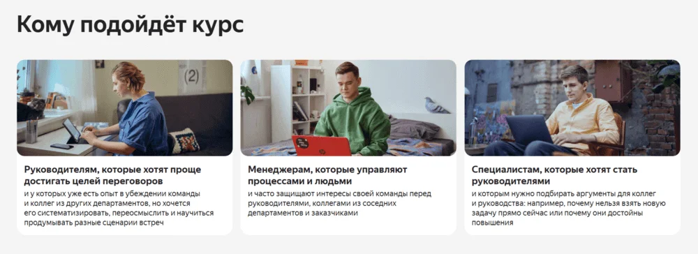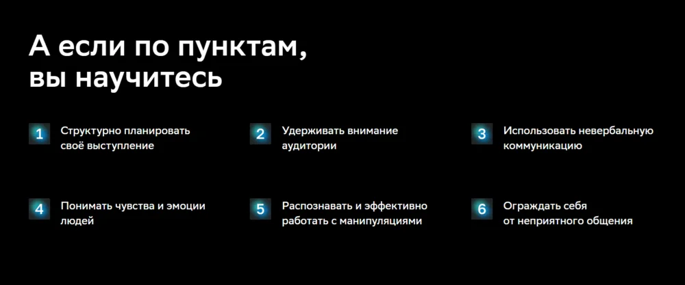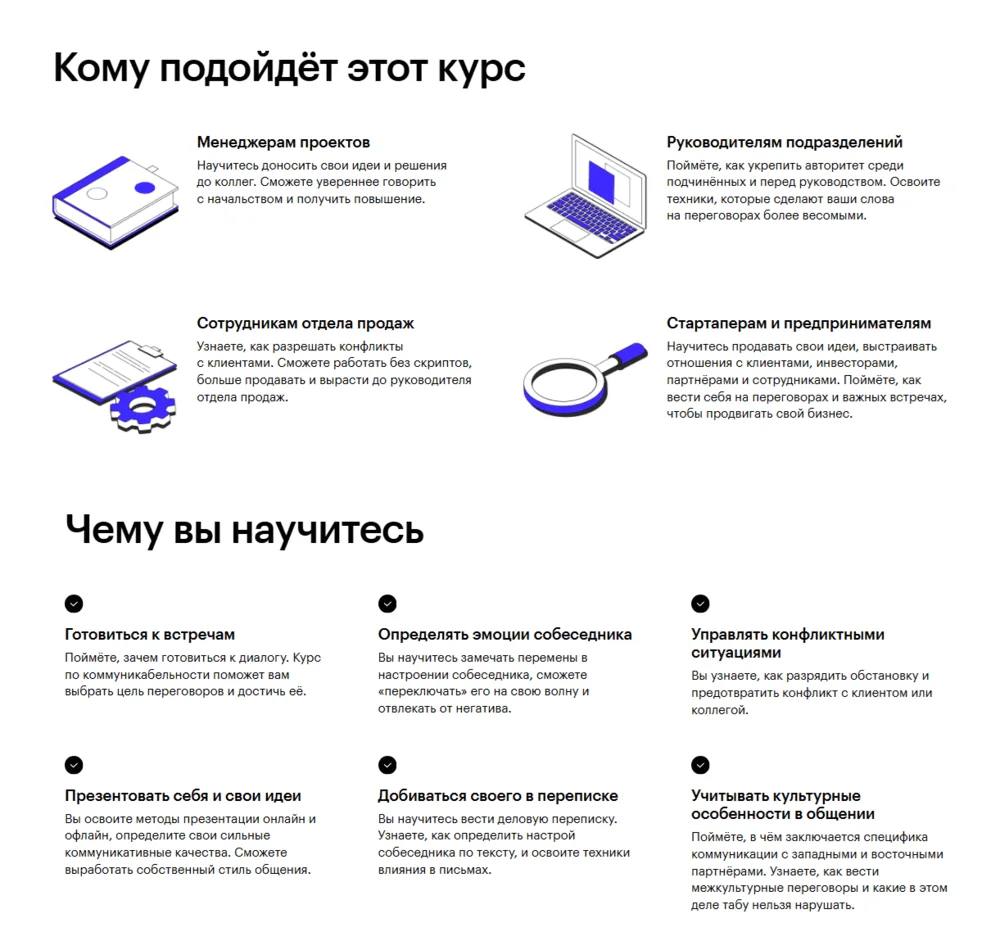Курс подходит тем, кто хочет найти свой стиль общения, уверенно выступать и отстаивать точку зрения как в диалоге с коллегами и начальством, так и с клиентами и партнёрами. Обучение состоит из видеолекций, игровых заданий и практических кейсов, которые проверяют кураторы — так вы получаете обратную связь и можете сразу улучшать свои навыки. В программе восемь тематических модулей: от структуры идеального диалога до межкультурной коммуникации и ролевых моделей.