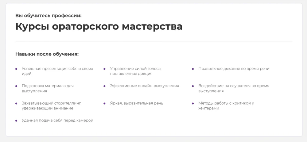Курс поможет побороть страх публичных выступлений, научит держать внимание аудитории и выстраивать речь структурировано — от «крючка» к яркому завершению. Обучение включает видеолекции, практические задания, вебинары и индивидуальную обратную связь от преподавателя. Всё это доступно в удобное время, а доступ к материалам остаётся навсегда. В программе раскрываются темы: работа с харизмой и эмоциями, риторические приёмы, работа с камерой и неожиданной реакцией публики. После окончания выдают диплом о профессиональной переподготовке и сертификат.