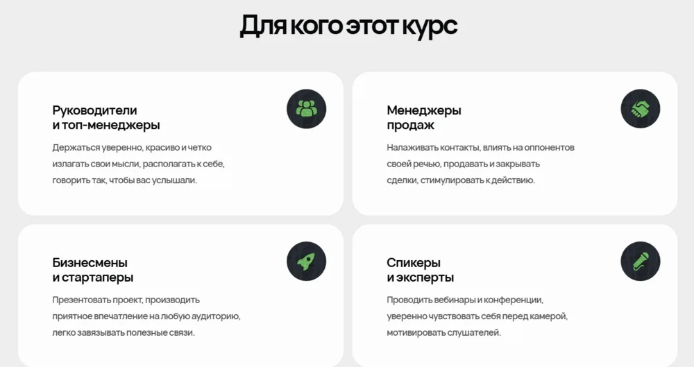 Курс рассчитан на тех, кто хочет уверенно выступать перед аудиторией, будь то презентации на работе, защита проектов или участие в вебинарах. Он помогает развить навык убеждать, отстаивать свою точку зрения и говорить свободно. Обучение проходит через видеолекции, практические упражнения, разбор реальных кейсов и презентаций в стиле Стива Джобса. Среди учебных модулей: «Как делать крутые презентации», «Эмоциональный интеллект», «Управление стрессом» и другое. Курс гибкий по графику, даёт доступ к материалам навсегда, включает куратора с обратной связью и бонус — курс по критическому мышлению. Выпускники получают диплом.