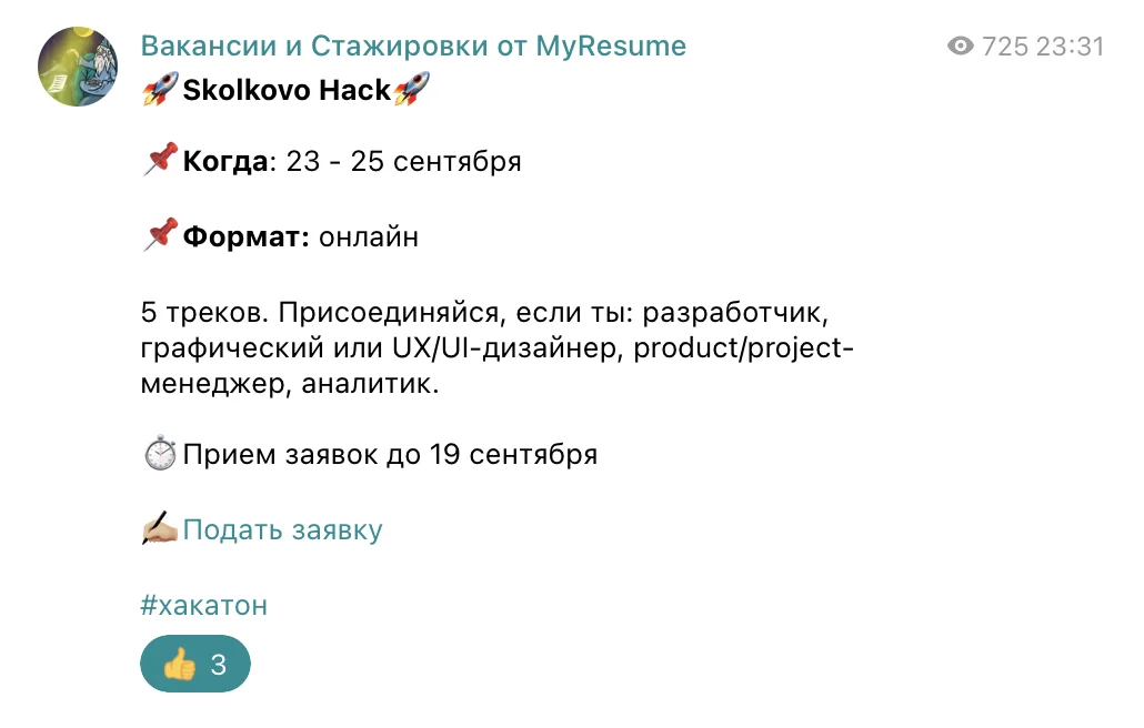 По возможности стараемся смотреть профили вновь прибывших подписчиков и ориентироваться при поиске вакансий на их запросы. Допустим, если видим, что пришло много геймдизайнеров — ищем вакансии и публикуем анонсы хакатонов преимущественно по этому направлению.