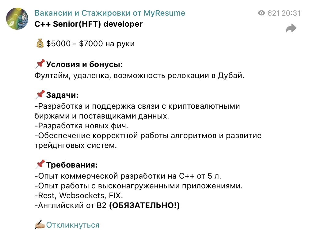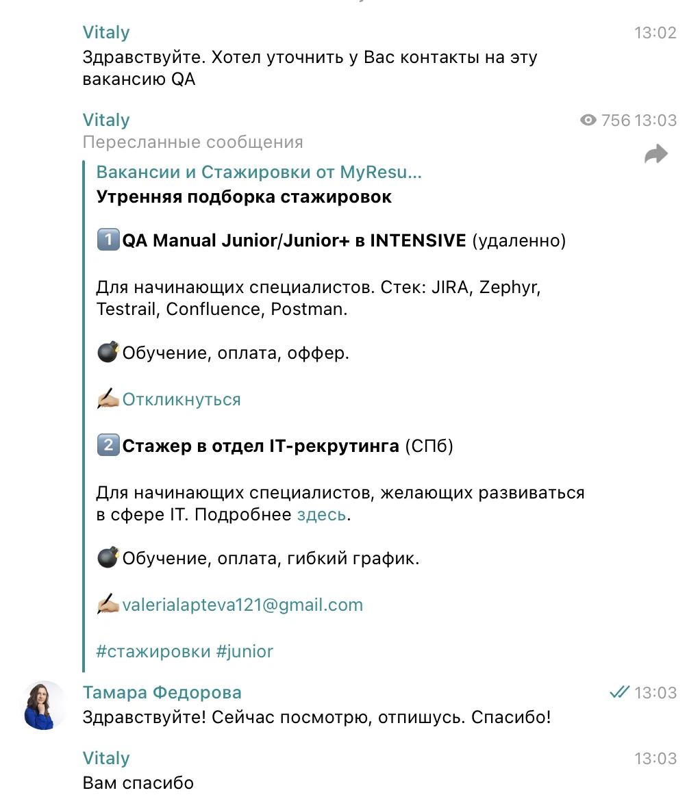 Плюс у нас определен график публикаций. Например, в 8 утра по Мск мы размещаем утреннюю подборку стажировок и предложения о работе для джунов, а затем каждые 1,5 часа — вакансии с оплатой от 80 000 рублей для опытных специалистов. Исключение — если компании просят срочно опубликовать пост с объявлением.