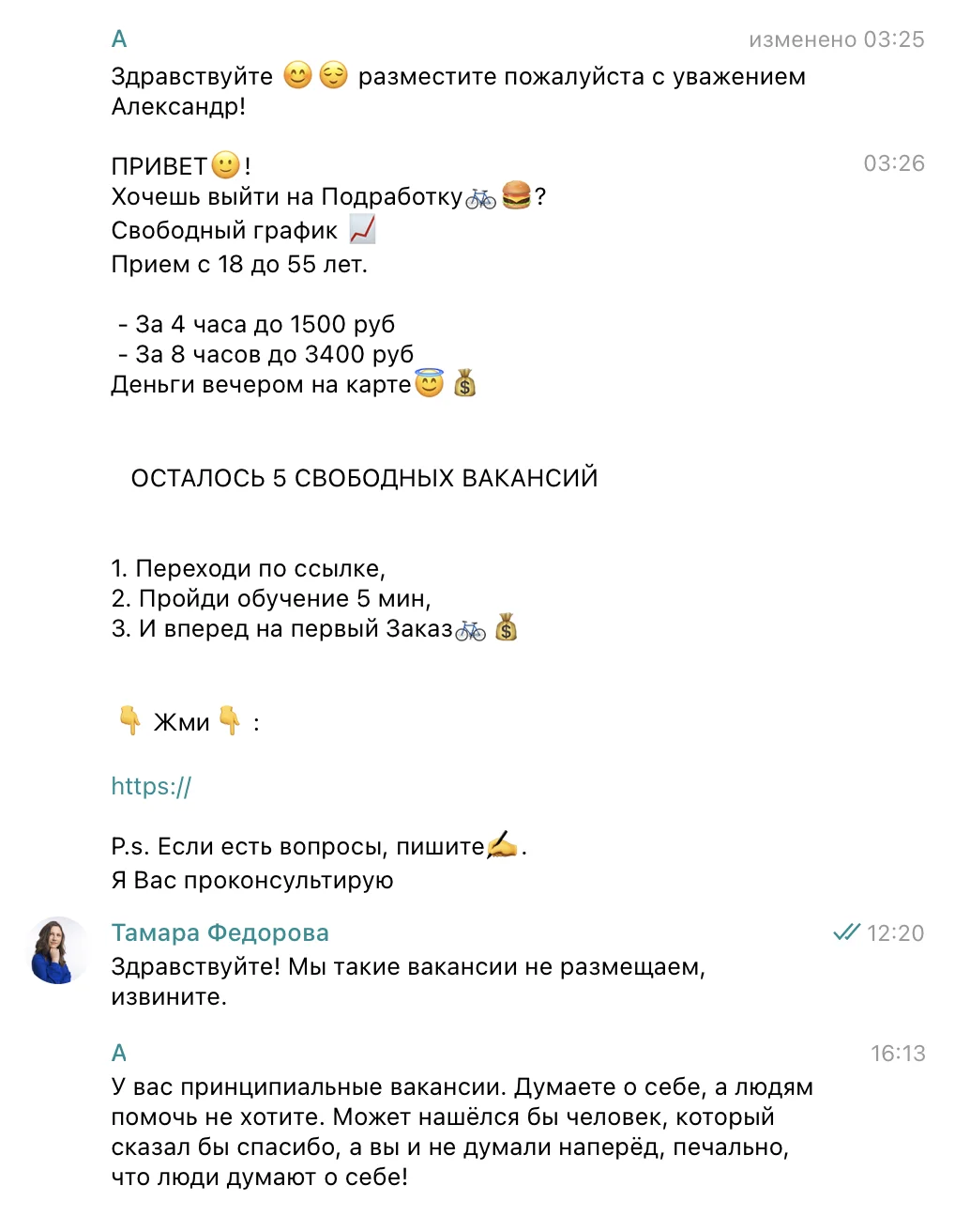Иногда вакансии звучат подозрительно. Например, когда работодатель обещает золотые горы за минимум усилий, при этом ни названия компании, ни чёткого функционала в объявлении не указывает. На просьбу пояснить, чем конкретно человек будет заниматься, все реагируют по-разному: кто-то благодарит за уделенное время, кто-то удаляет переписку, редко — пишут в ответ негатив.