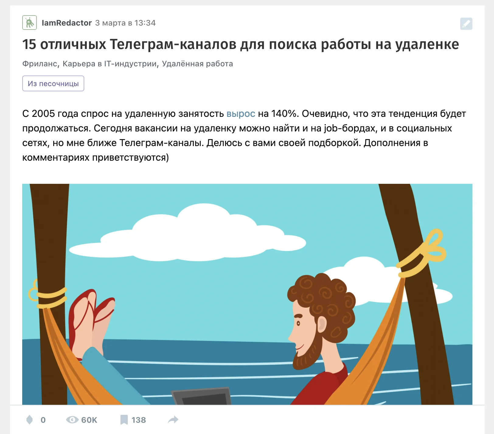 Моя основная деятельность в проекте связана с текстами, поэтому продвижение Telegram-канала было проще начать через внешние ресурсы с хорошей посещаемостью. Так как мы размещаем вакансии преимущественно для айтишников, то из всех площадок выбор пал на Хабр. Не скажу, что этот путь был лёгким: мою первую статью модераторы отклонили, а вторую опубликовали только спустя две недели после отправки.