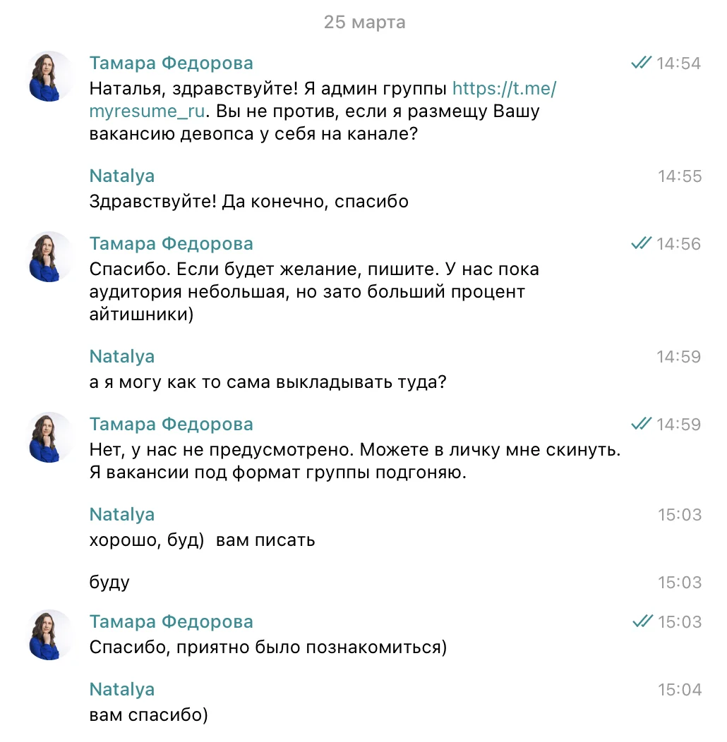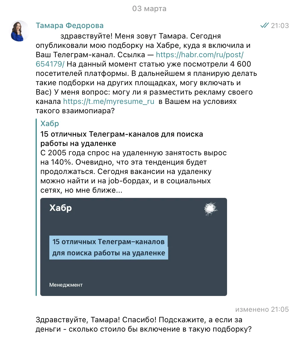 Иногда я оставляю комментарии в HR-сообществах. Это уже по делу, в ответ на запросы о том, где можно опубликовать вакансии бесплатно. А в первые месяцы после создания канала я писала эйчарам в личку. Никакого негатива от моих сообщений не последовало, наоборот, со многими HR-менеджерами до сих пор сотрудничаем.