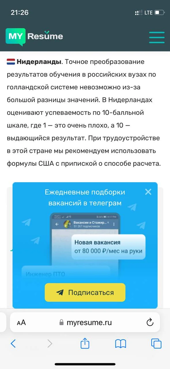 Наш основной сайт — myresume.ru. На момент написания статьи его посещаемость составляет около 200 000 пользователей в месяц. Чтобы привлечь аудиторию с нашего сайта в Telegram, мы включили нативный всплывающий баннер с рекламой. В итоге на канал перешло около 600 пользователей. При том, что баннер пока доступен только в мобильной версии — с появлением в десктопе количество переходов увеличится.
