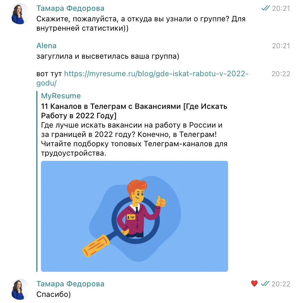 Привет, я Тамара, главный редактор карьерного портала MyResume. В феврале 2022 года наша команда запустила Telegram-канал с вакансиями и стажировками. Сейчас у нас 4 000 подписчиков, из которых больше половины мы привлекли бесплатными методами. Если вы пока не готовы тратить деньги на продвижение или пребываете в шоке от нынешней стоимости рекламы — эта статья для вас.