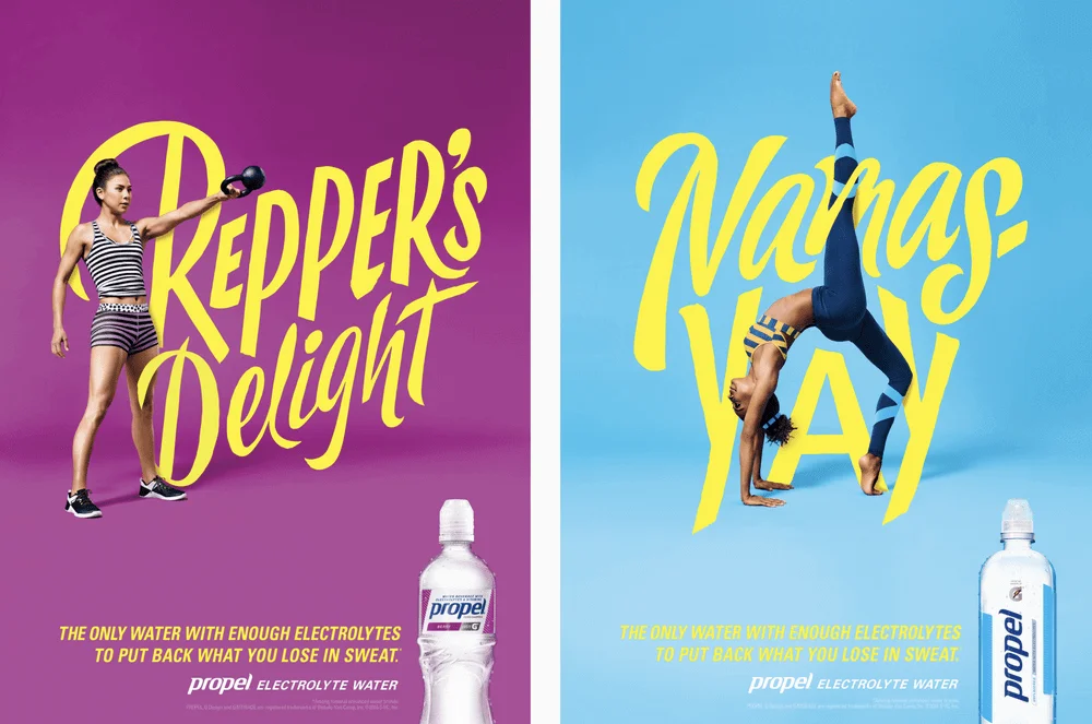 Неоновый леттеринг в рекламе питьевой воды Propel является центральным элементом композиции, в который гармонично интегрированы фотографии спортсменов.