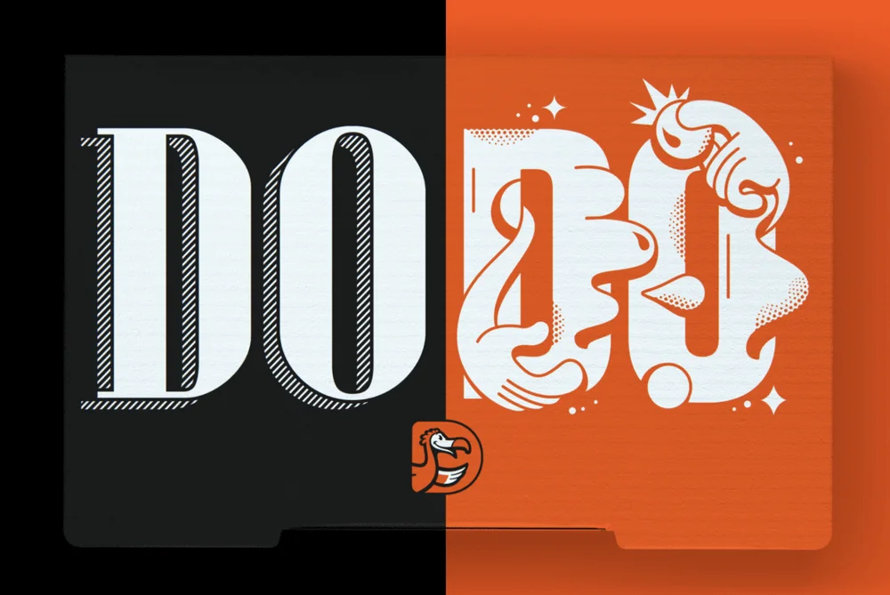 Логотип «Додо Пиццы» в изначальном варианте представляет собой шрифтовую композицию с символом-птицей. Но иногда его трансформируют под разные события и рекламные кампании. В следующем примере именно такой случай, с использованием приемов леттеринга. Первые две буквы DO выполнены в строгом стиле на черном фоне, а вторые DO оформлены декоративными элементами, напоминающими иллюстрацию. Они выглядят игриво, а иллюстрации рук создают эффект взаимодействия букв друг с другом.