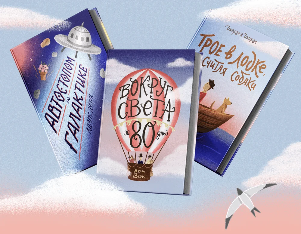 На обложках книг ниже названия также удачно интегрированы в иллюстрации. Для книги «Автостопом по галактике» использован футуристичный, космический стиль букв, соответствующий тематике произведения. А сама надпись динамично «летит» за космическим кораблем, подчеркивая его скорость. На обложке «Вокруг света за 80 дней» название вписано в воздушный шар. В названии «Трое в лодке, не считая собаки» уникальные буквы передают настроение произведения.