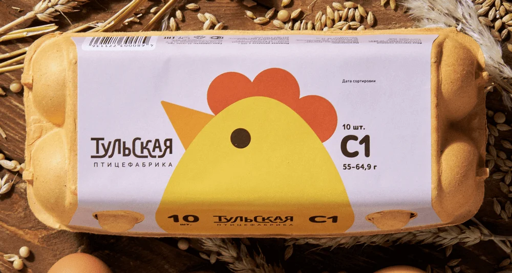 В логотипе «Тульской птицефабрики» на упаковке яиц линии буквы продлены снизу в разные стороны. Это обеспечивает целостность композиции и делает надпись узнаваемой.