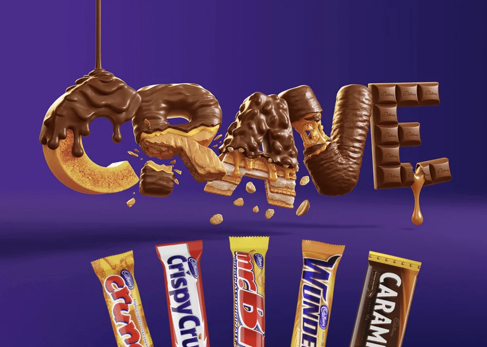 В рекламе шоколадок Crave буквы стилизованы под продукты бренда: батончики с вафлями, орехами и глазурью. Каждая буква демонстрирует начинку одного из продуктов, показанных ниже. Выглядит аппетитно и помогает аудитории определиться с выбором.