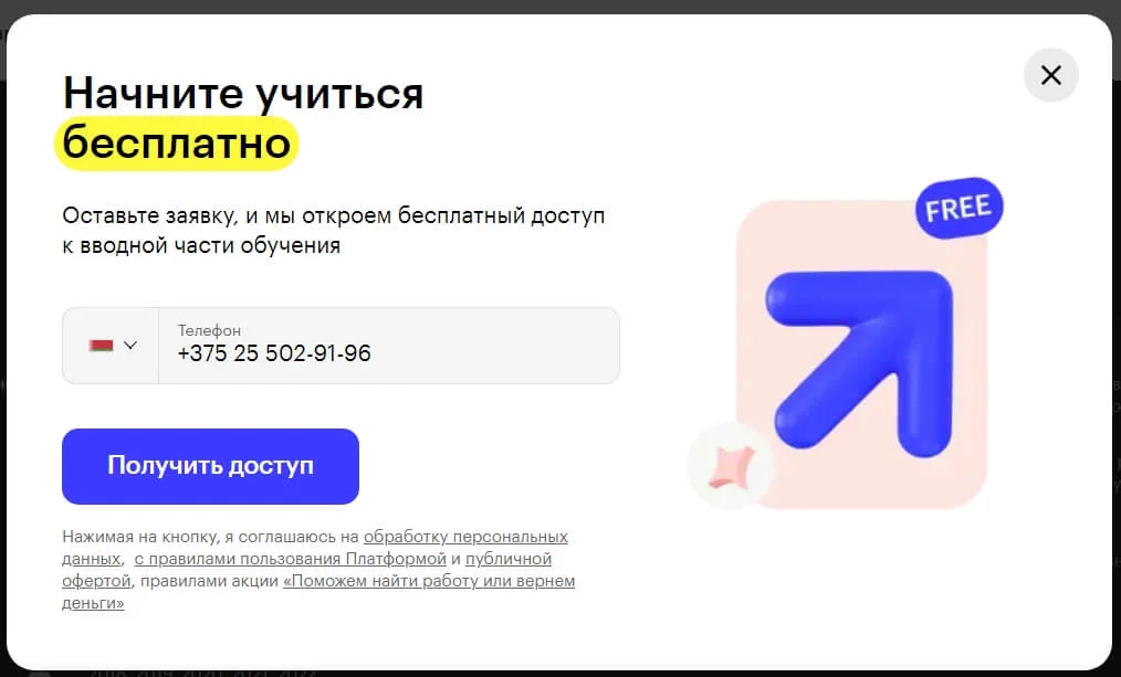 Вот хороший пример лид-магнита. Skillbox предлагает пройти часть обучения бесплатно взамен на номер телефона: