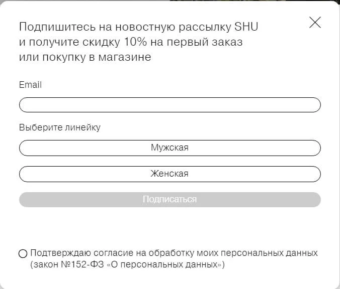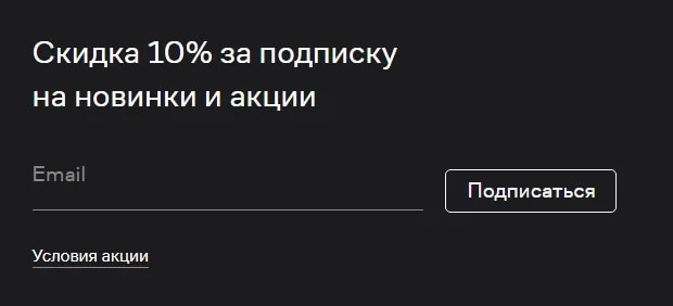 Интернет-магазин Lamoda дарит скидку: в обмен на email каждый подписчик получает скидку 10%.
