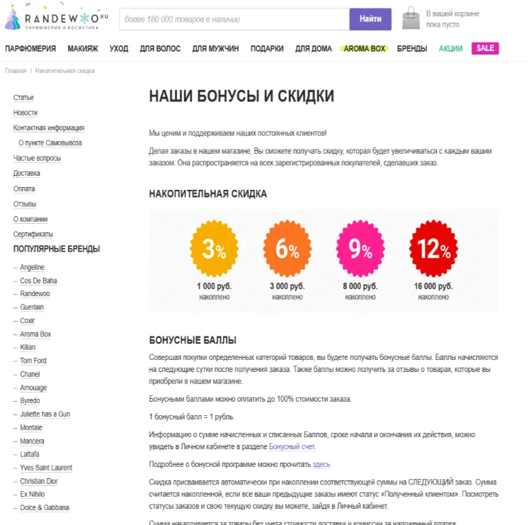 В магазине парфюмерии Randewoo программа лояльности выстроена за счёт двух самых популярных приемов — накопительная скидка и бонусные баллы. При достижении покупок на определенную сумму, клиент получает повышенную скидку на следующие заказы. Вдобавок за отдельные категории товаров клиент получает баллы, которые можно тратить на следующие покупки.