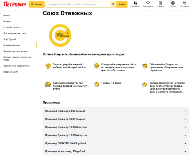 Другой пример — сеть строительных гипермаркетов «Петрович». Здесь программа лояльности выстроена на выгодных предложениях от партнёров бренда. Участник программы накапливает бонусы за покупки и обменивает их на промокоды «Петровича» (бесплатная доставка, скидки на товары отдельных брендов) или партнёров — «Диван.ру», «Аскона», «РивГош», сервисов BelkaCar, «Литрес» и других брендов.
