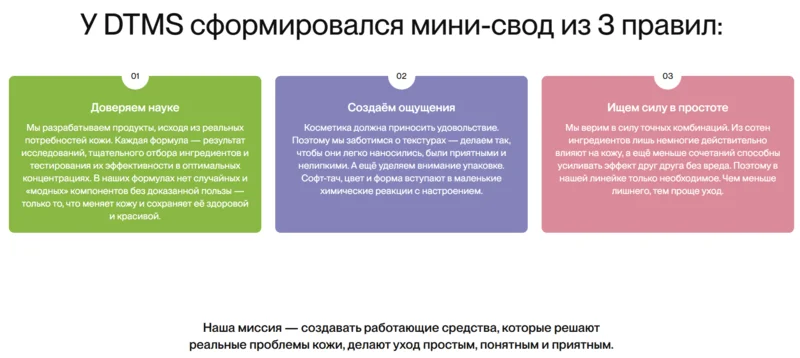 Хороший пример бренда, который выстраивает лояльность с упором на качество — косметика Don't Touch My Skin. Вместо ярких обещаний и акций компания делает ставку на пользу продукта и стабильный результат. В коммуникациях бренд регулярно объясняет, как работают средства, из каких ингредиентов они состоят и для каких задач подходят. Все средства выпускаются без ароматических отдушек, а минималистичный дизайн и софт-тач упаковка подчёркивают функциональность и удобство использования. Дополнительно бренд предлагает рефилы, чтобы клиент мог использовать уже купленную банку — это снижает стоимость повторных покупок и упрощает использование продукта.
