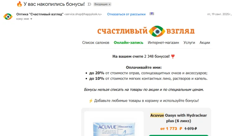 Например, в рассылках оптики «Счастливый взгляд» для постоянных клиентов бренд напоминает об остатке бонусных баллов и условиях использования. А также предлагает персональную подборку товаров, которые можно купить со скидкой, на основе предыдущих покупок пользователя.