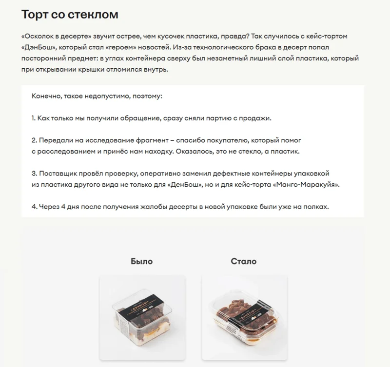 Отлаженный механизм работы с негативом у «Вкусвилла». В рассылках, бренд-медиа и соцсетях сеть супермаркетов откровенно делится историями неудач и скандальных случаев. При этом в разборе каждого кейса в центре внимания — пошаговый алгоритм, как отрабатывалась проблема, как удалось её решить и как это повлияло на контроль качества продукции.