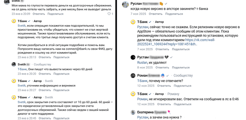 Т-Банк активно отвечает на большинство комментариев пользователей в соцсетях, отслеживая не только комментарии внутри собственного сообщества, но и на внешних ресурсах. Если пользователь сообщает о своём негативном опыте — менеджеры уточняют информацию и инициируют личный диалог по проблеме.