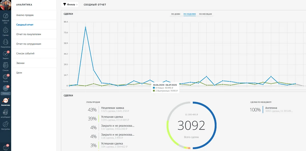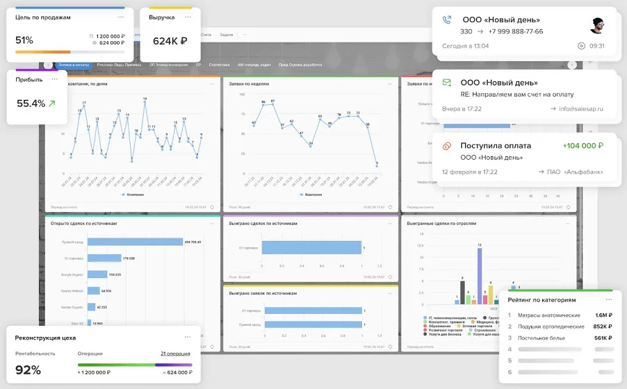 amoCRM — это CRM-система, которая помогает выстроить прозрачную воронку продаж и автоматизировать работу с клиентами. Сервис собирает лиды с сайта, мессенджеров, соцсетей и рекламы в одном интерфейсе, позволяет отслеживать статус каждого клиента и ускоряет процесс принятия решений благодаря понятной аналитике. Подойдет небольшим и средним компания с отделом продаж.