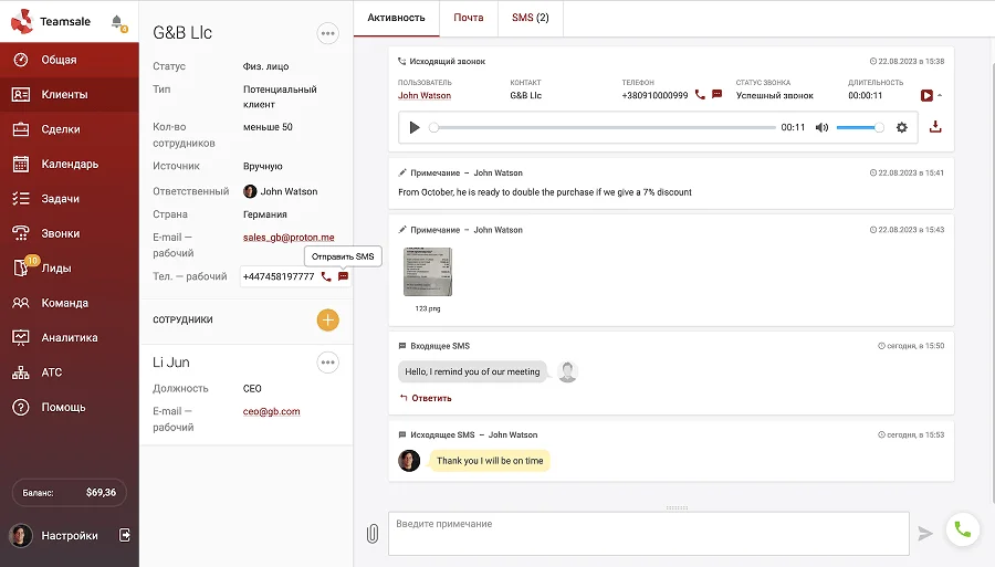 Преимущества: единая платформа для контроля продаж, задач и документооборота, встроенная телефония, мобильное приложение, гибкая настройка доступа и ролей.