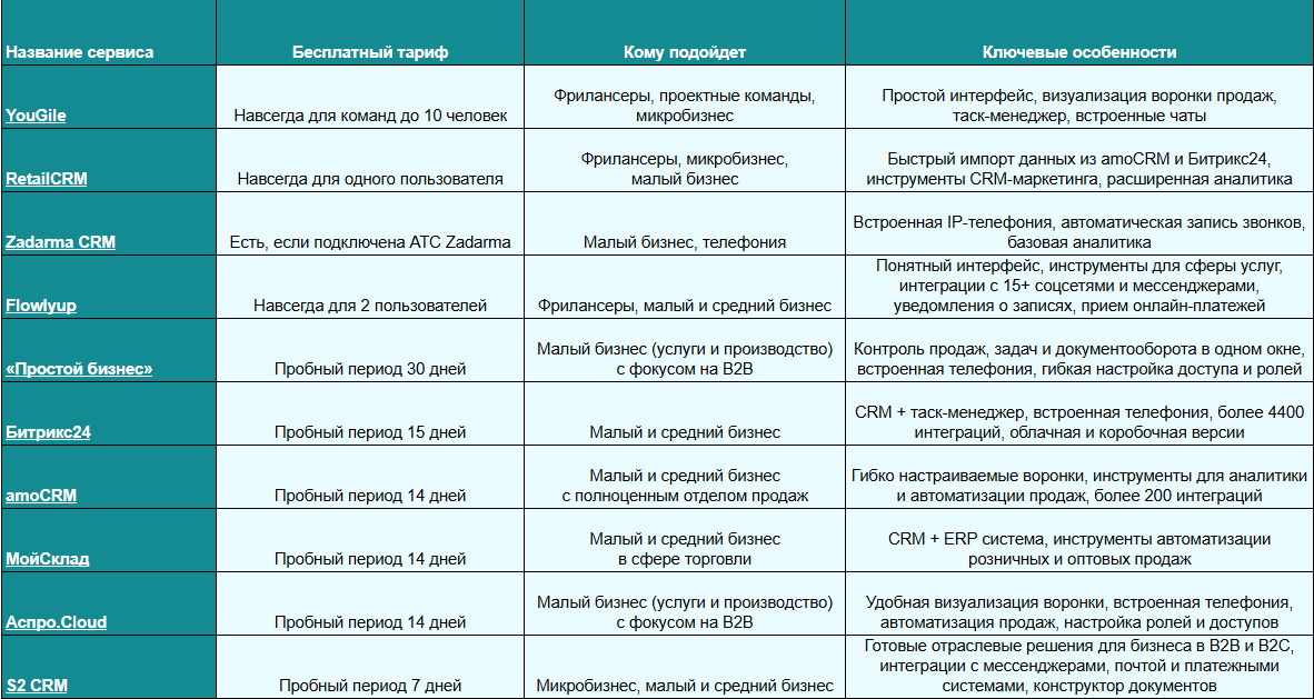 Подготовили таблицу, чтобы вам было удобнее сравнить возможности каждой CRM-системы и выбрать лучший сервис под свои задачи: