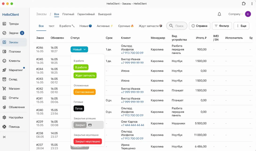 HelloClient — облачный сервис, объединяющий CRM-систему, маркетинг, финансовый и складской учет. Подходит как для сферы услуг, так и для торговых компаний или небольших магазинов (кроме продовольственных).