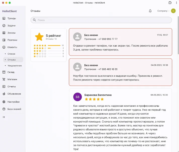 | HelloClient | от 788 ₽ | ➕ | ➖ | ➕ | складской и финансовый учёт, расчёт зарплат, сбор отзывов |