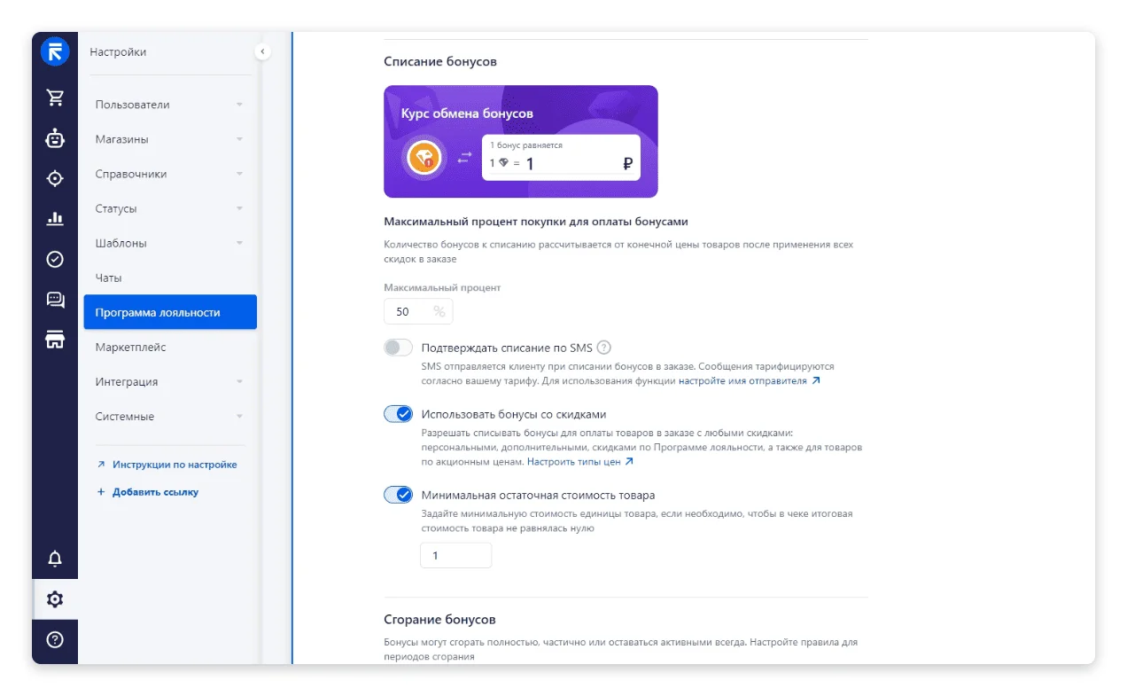 Программа лояльности. В CRM можно выстроить правила: как происходит начисление и списание бонусов, когда они сгорают, что будет, если клиент оформит возврат.
