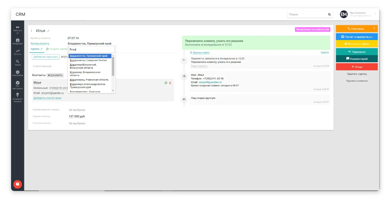 Часовой пояс. Если клиент находится в Калининграде, а менеджер — в Москве, время клиента будет отображаться в карточке сделки.
