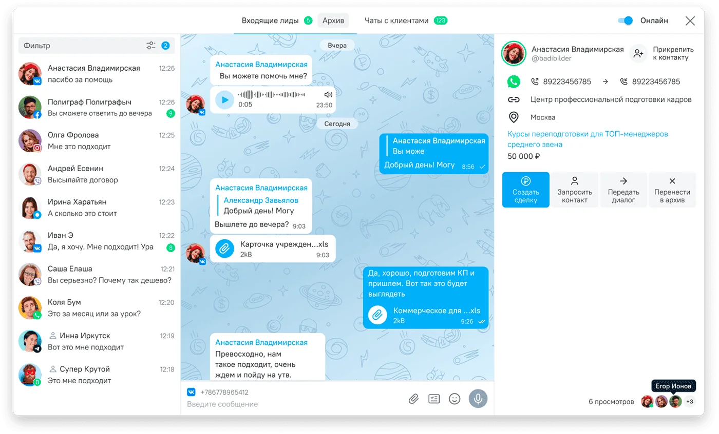 Один чат для всех обращений. Сообщения из Max или Avito лежат в одном чате, а сотрудникам не надо мониторить несколько источников заявок.