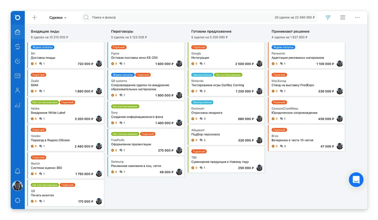 Решения, которые подойдут большинству компаний: OkoCRM, amoCRM, Битрикс24, RetailCRM, EnvyCRM, «Мегаплан». Для сферы услуг лучше выбирать между AppEvent, HelloClient.