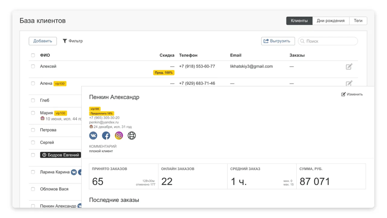 База клиентов. Это хранилище данных покупателей: номеров телефонов, email-адресов, банковских реквизитов.