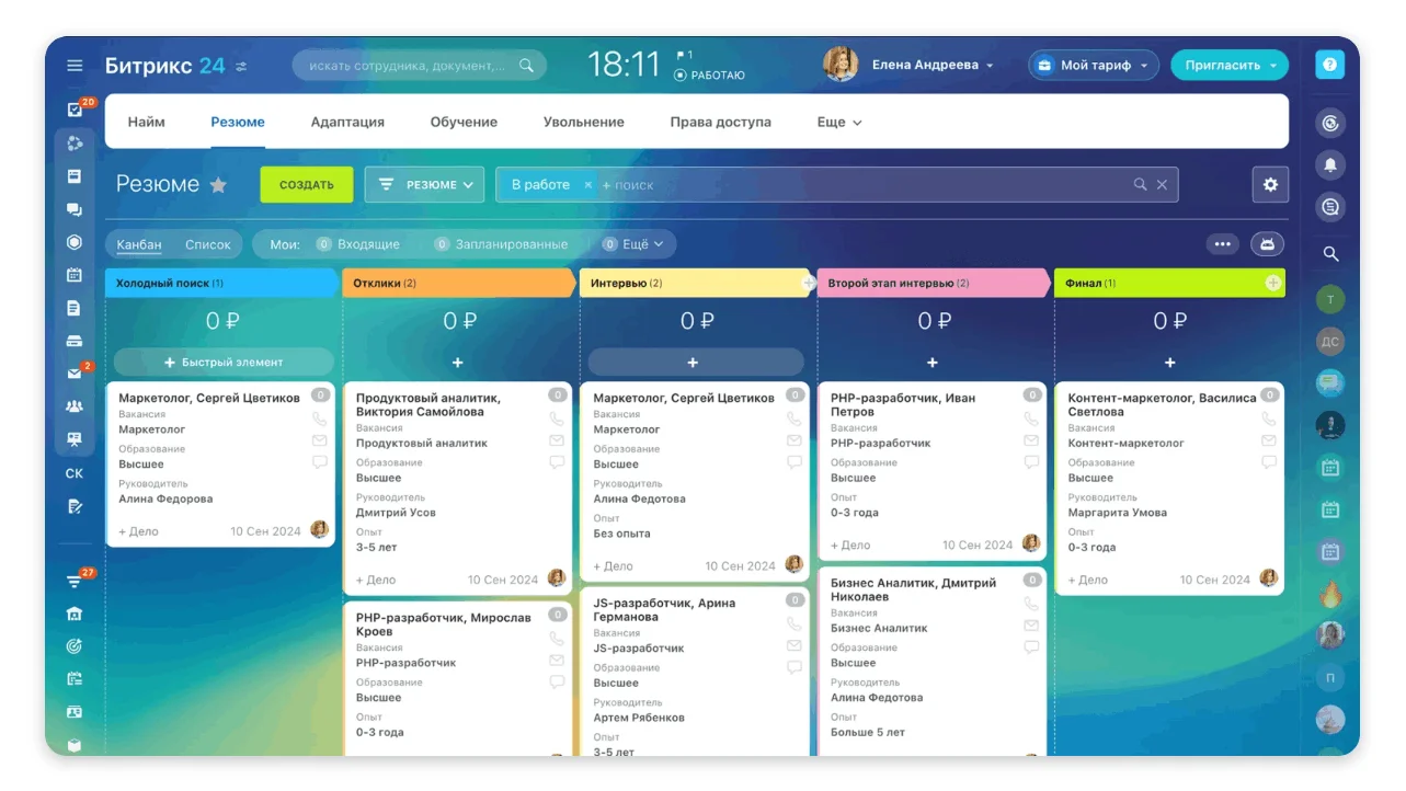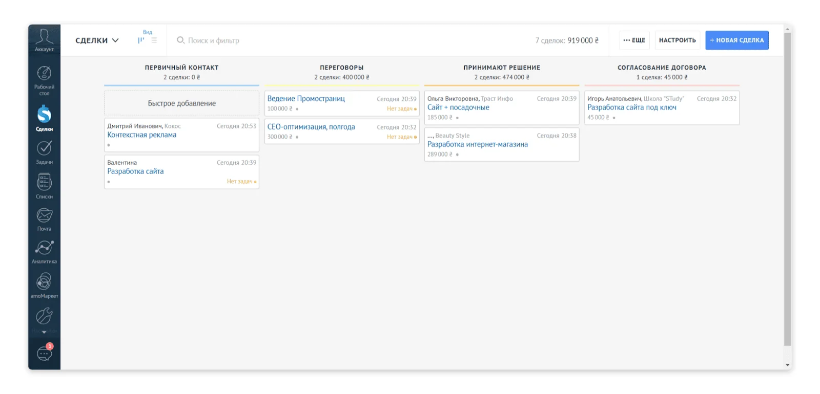 Воронка продаж. В этом модуле можно настраивать этапы работы с покупателями под свою специфику и визуализировать нагрузку команды. Такие воронки можно использовать для обеспечения техподдержки клиентов.