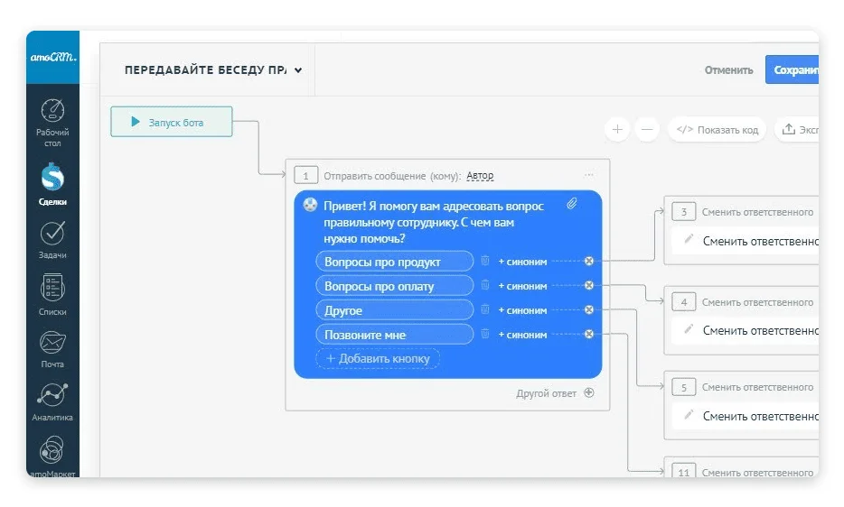 Роботы. Для типовых процессов вроде ответа клиентам в нерабочее время есть настроенные боты. Также есть конструктор, чтобы настраивать роботов под задачи компании. Боты умеют отвечать по скрипту, назначать ответственного сотрудника за конкретную сделку, менять этапы воронки продаж для карточек и т.д.