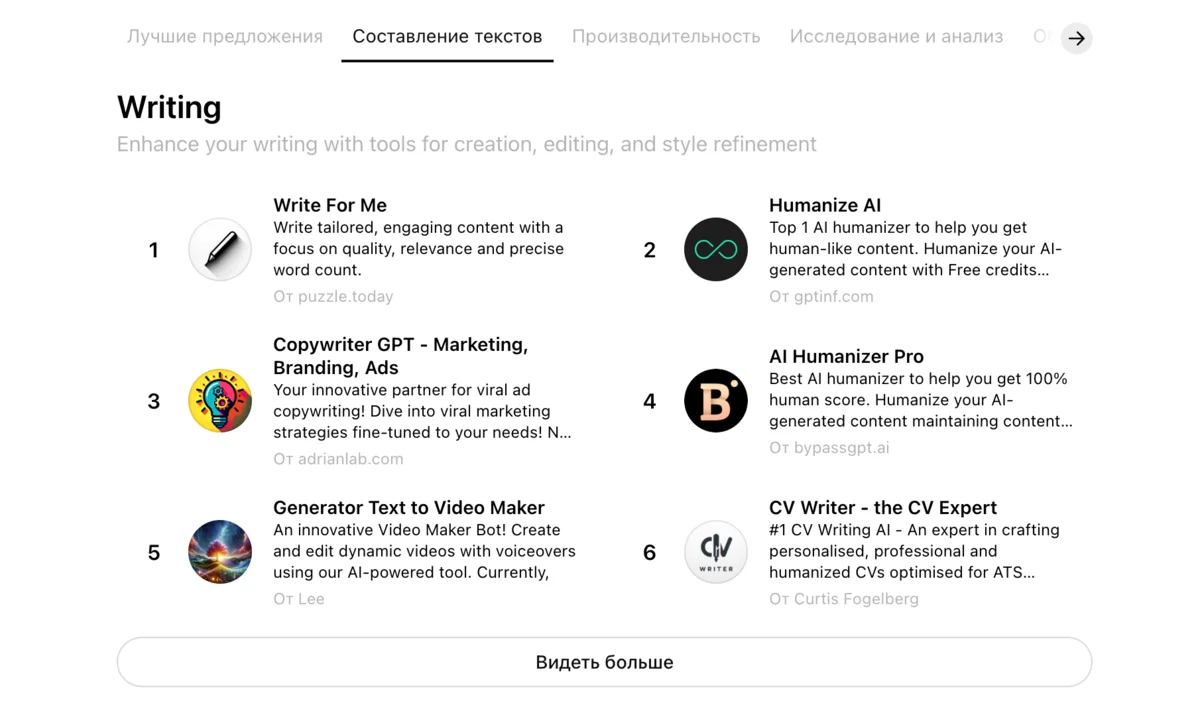 Не хочется думать над промптами? В разделе «Обзор GPT» уже собраны готовые модели для решения разных задач: помощники по копирайтингу, создатели логотипов и креативов, редакторы изображений и дата-аналитики.
