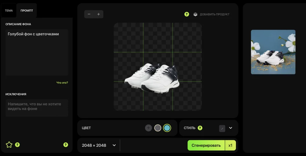 Сервис генерирует фон для объектов по запросу или теме. При загрузке изображения ИИ автоматически удаляет фон. Можно написать свой промпт для генерации окружения или выбрать готовый стиль, например, «в кафе», «на пляже», «в студии». Если идеи для фона отсутствуют, воспользуйтесь функцией «Удиви меня» — нейросеть подберет фон на свой вкус.