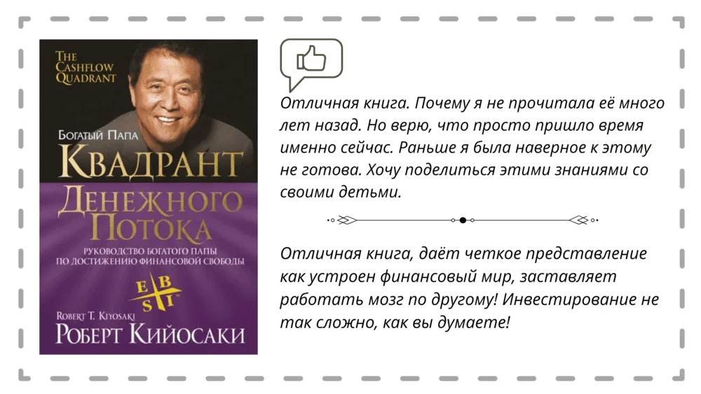 Книга является продолжением «Богатого папы». Она объясняет четыре квадранта дохода: сотрудник, самозанятый, владелец бизнеса и инвестор. Кийосаки показывает, как перейти из левых квадрантов (где вы работаете за деньги) в правые (где деньги работают на вас). Книга предлагает стратегии для создания бизнеса и инвестиций, чтобы достичь финансовой свободы.