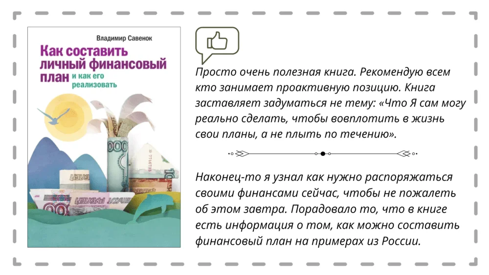 Владимир Савенок учит, как составить личный финансовый план, начиная с небольших сумм. Книга предлагает пошаговые инструкции по бюджетированию, сбережениям и инвестициям. Она помогает читателям достичь целей, таких как покупка жилья или обеспечение пенсии. Это практическое руководство для тех, кто хочет управлять финансами осознанно.