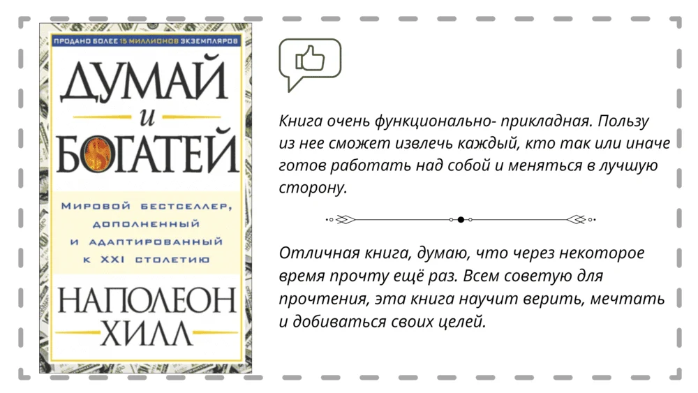 Написанная во времена Великой депрессии, книга основана на интервью с успешными людьми, такими как Генри Форд. Наполеон Хилл выделяет 13 принципов успеха, включая постановку целей, веру в себя и силу подсознания. Книга вдохновляет читателей изменить мышление, чтобы достичь финансовых и личных целей, и остаётся актуальной благодаря универсальным идеям.
