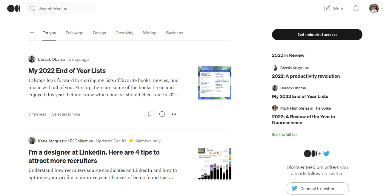 Самые популярные темы ― дизайн, бизнес, маркетинг, писательство. А вообще на Medium можно писать о чем угодно, ограничений нет. Хорошие статьи не только попадают в рекомендации, но и неплохо ранжируются в поисковиках, поэтому своего читателя может найти каждый.