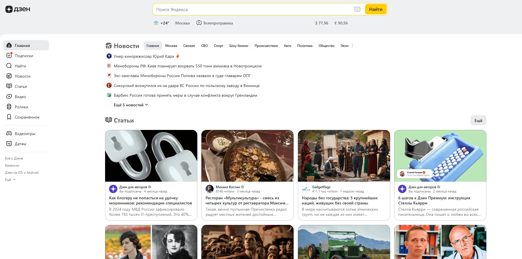 Изначально тоже был рекомендательной площадкой, посты из Дзена показывались на главной странице Яндекса, поэтому собирали много просмотров. Сейчас Дзен выглядит по-другому. Его нет на главной поиска, а на главной странице Дзена сначала показываются новости, потом идет лента рекомендаций, которая состоит не только из статей, но и видео, коротких роликов.