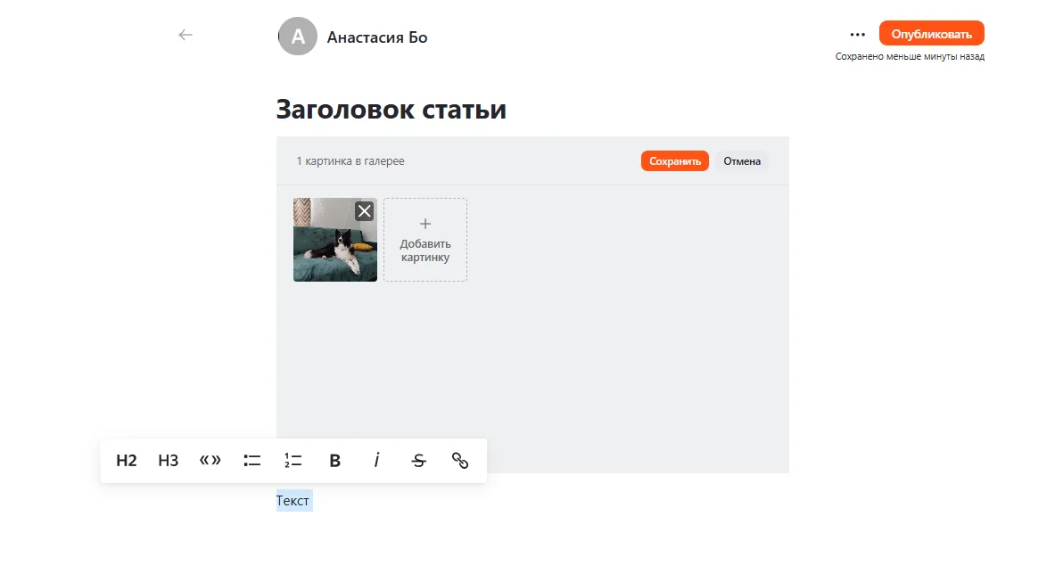 Текстовый редактор очень понятный. Есть все необходимые инструменты, чтобы оформить текст: менять уровни заголовков, добавить видео, фото, опрос, маркированный список, цитату и т.д. Можно сохранять текст в черновиках и даже сделать предпросмотр на странице.