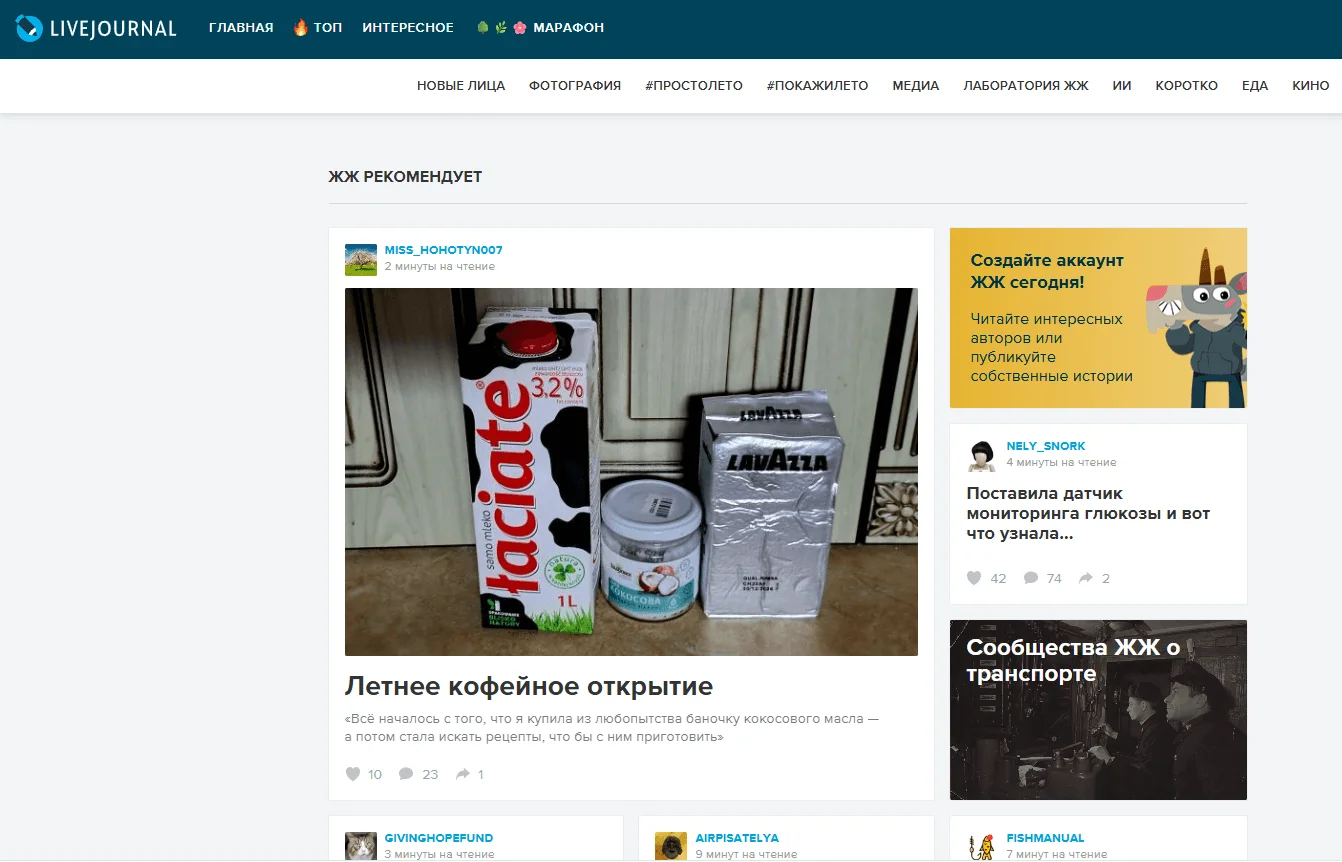 Это не совсем рекомендательная система, но частично она здесь тоже есть. Проблема лишь в том, что количество пользователей «ЖЖ» не прибавляется и по данным SimilarWeb уникальных пользователей в месяц около 15 млн (для сравнения в ВКонтакте ― 96 млн). Поэтому нет смысла ждать огромной активности под постами. Хотя тут есть и свои местные звёзды (первой на ум почему-то всегда приходит скандально известная Лена Миро).