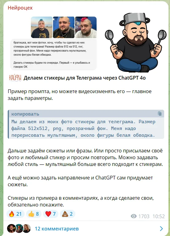 О чем пишут. Канал делится новостями из мира нейросетей и интересными исследованиями. Обсуждают, как ИИ взламывает сам себя, почему Claude не галлюцинирует, а Midjourney стал понимать стили. Еще есть гайды по созданию чего угодно с помощью ИИ: от картинок до музыки.