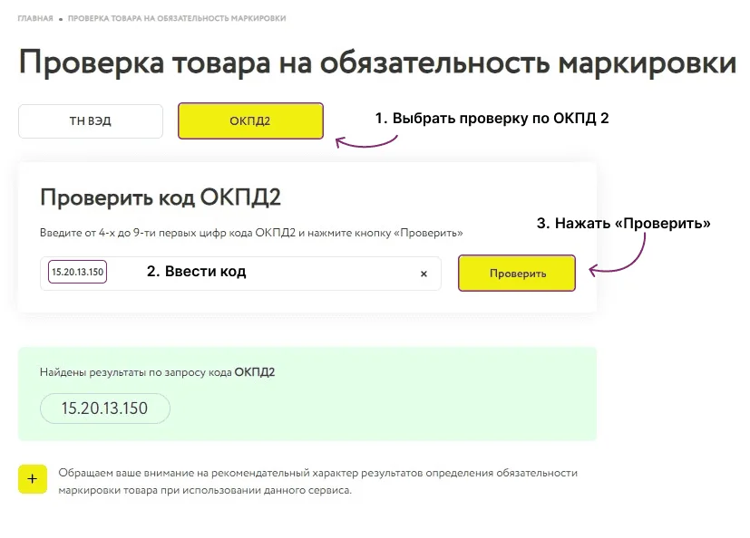 Проверить товар в Честном знаке. Когда узнали код ОКПД 2 или ТН ВЭД товара, нужно проверить на сайте Честного знака, подлежит ли он маркировке.
