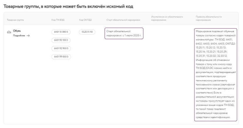 Если товар нужно маркировать, ниже высветится окно с информацией, когда нужно начинать маркировать и какие правила маркировки.