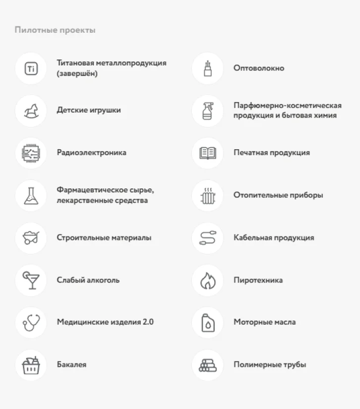 Полный список экспериментальных товаров можно найти на сайте Честного знака в разделе «Товарные категории».