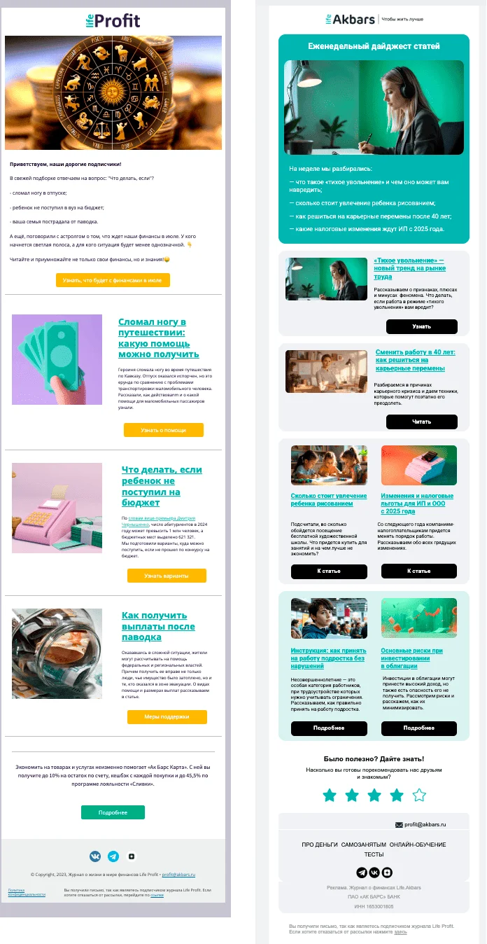 Задача. Раз в неделю журнал Life.Akbars отправлял подписчикам дайджесты со статьями. Команда проекта хотела сделать редизайн писем, чтобы сменить устаревший вариант оформления на более современный и визуально привлекательный.