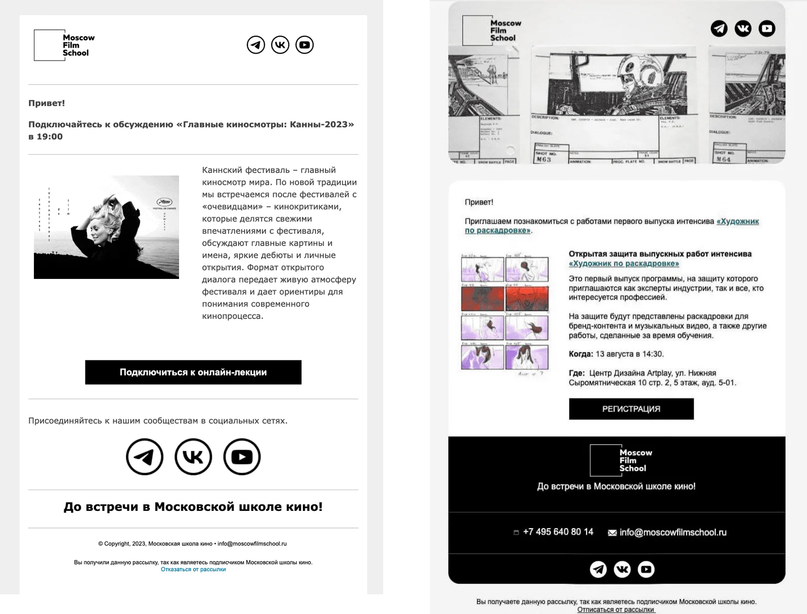 Результат. По словам клиента, обновленный шаблон позволил визуально улучшить рассылки. Команда Московской школы кино отметила высокий уровень сервиса и оперативность работы нашего агентства.
